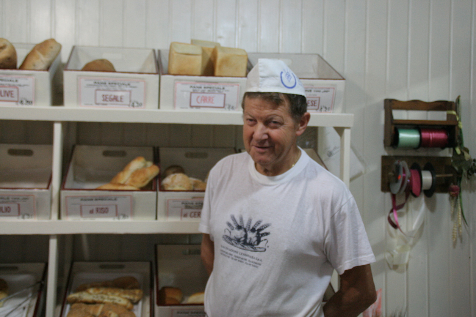 Oggi il lavoro è molto calato, il guadagno anche, gli anni passano ma voi siete qua. Perché continuate in modo quasi ostinato? A Gianna, scappa una lacrima. Poi dice Qui c’è una storia. Questo posto fa parte di noi. Il fatto di fare le cose solo in un certo modo. Tutte le cose. Anche questo piccolo restauro non tecnologico, genuino, fatto da noi. Questo è il nostro stile. E poi dobbiamo anche lavorare per la pensione. Marino, risponde per ultimo, con il suo stare in disparte, il suo parlare a voce bassa. Colpisce la grande semplicità di questo vero panettiere che ha tanta esperienza, tanto da dire, tanto sapere da trasmettere ma non sbandiera nulla. Perché siamo ancora qui? Beh, c’è la baracca da tenere su. Pausa, poi riprende Ma la baracca senza passione non sta in piedi. Non sta. Ho dato la vita qui. La cosa più importante è la passione. Con la passione si crea, si fa. Senza non si va da nessuna parte. Gianna chiede se può aggiungere una cosa La voglio dire perché per me è importante. Per noi qui conta molto la relazione. Ci piace parlare con le persone. Ci conosciamo. Se un anziano ha l’influenza e chiama, il pane glielo portiamo a casa, anche se è solo una s’ciopeta. E magari già che ci siamo gli buttiamo l’immondizia. Il loro mestiere è anche questo, vivere le relazioni. E quale simbolo millenario di relazione può essere migliore del pane?